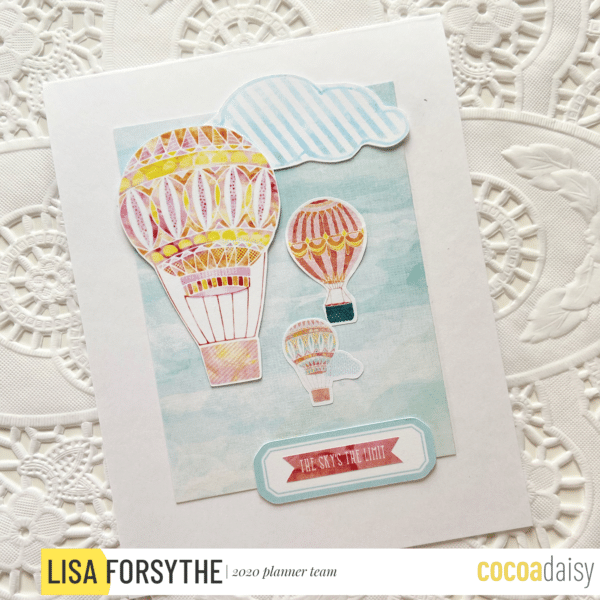 Next up is a card that uses everything from various kits. On a white card background I adhered one of the pocket cards that had the clouds onto the white card. All I did next was layer a large hot air balloon die cut and two various hot air balloon stickers of different sizes from the sticker kits so that they looked like they are farther away. Next I used one of the labels and layered a sticker over it to give it some depth and that’s it! Easy peasy and it was so fun to do!