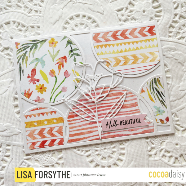 I used the circle cut out die from The Stamp Market  and this particular die is fun because of all the possibilities! I used the die and cut one from white card stock and used three of the Cocoa Daisy papers from the kits and used the die to cut them out. You then adhere the patterned paper cuts into the circles that they fit into like a puzzle.  It’s so fun and therapeutic! I used a white tulip die cut also from the stamp market to add to the front and then a sentiment die from one of the Memory kits to finish it off. It’s so bright and cheery and I can’t wait to send it off to brighten someones day!