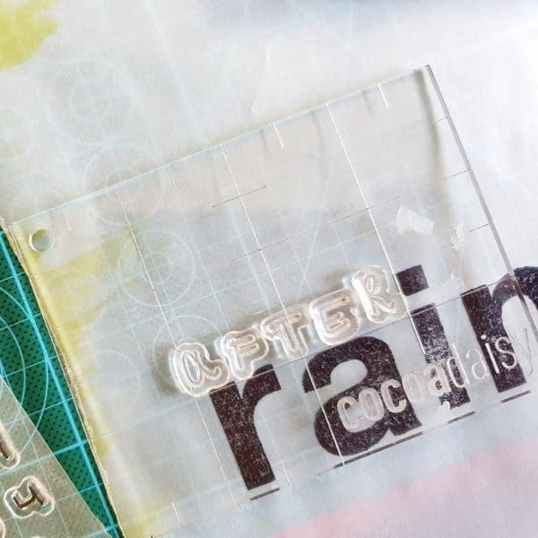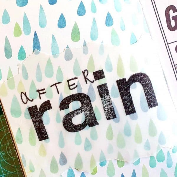 “When you have completed stamping the title just cut or tear the vellum to the desired size and paste it on your page. I use roller glue so you don’t see anything!