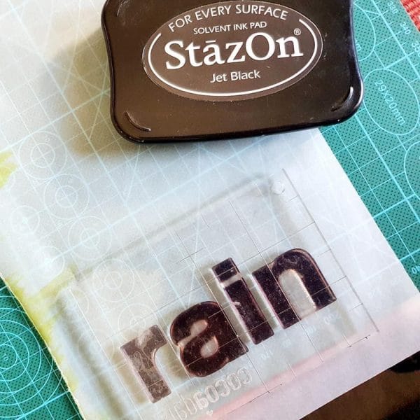 “You will only need vellum paper, a pad for multi-surface stamps (I use stazon), alphabet stamps to your taste and if you have a cutting mat or a striped or squared sheet that allows you to stamp straight. I combined various stamps to create the titles and stamped one word at a time by placing the vellum on the cutting mat. I am attaching photos of my steps because it is easier to do it than to explain it!”