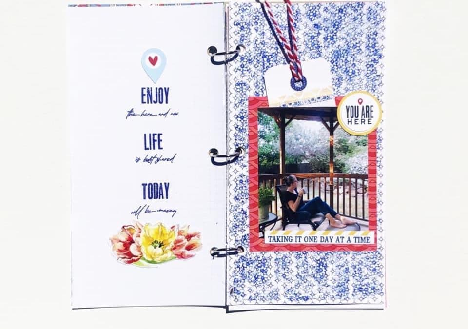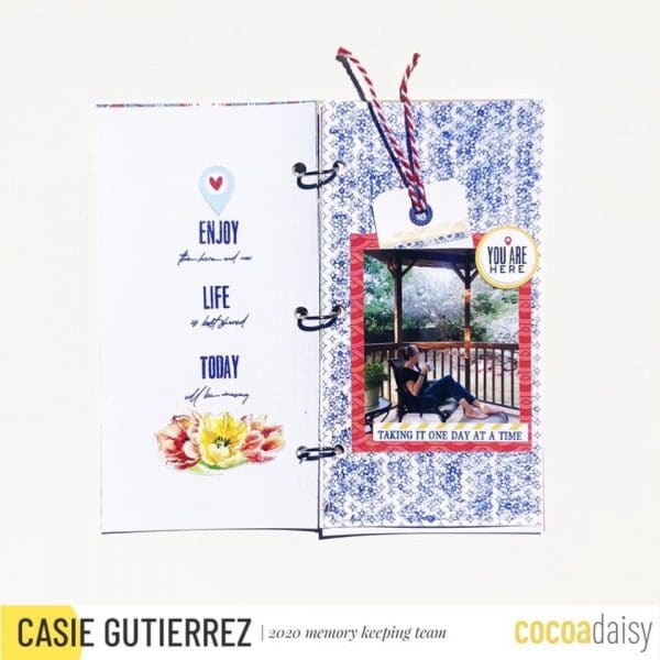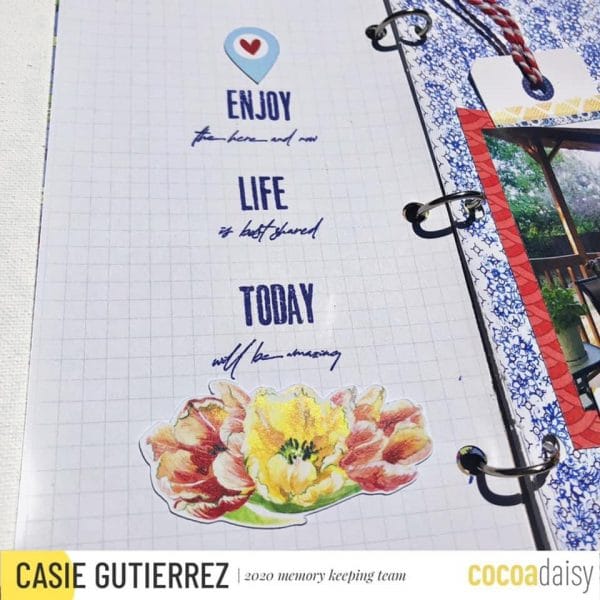 “I deconstructed the Dori and reassembled it using ring clips. On the left side, I created a title for the layout using the exclusive stamp set from the kit. I love the variety of larger capital block letters and script font. Above and below the stamping I added a floral die cut and geotag.”