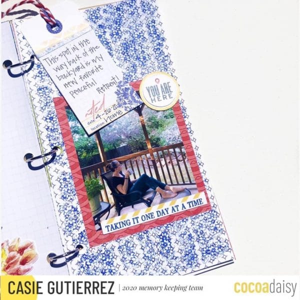 “On the right side, I first created a background using the flower stamp in a vertical pattern covering the page completely. Behind the photo is a slip pocket for a journaling tag telling about my new favorite relaxing spot in the backyard. The layers of the tag include the post-it note from the planner kit along with washi strips from the Daisy weeks stickers.”