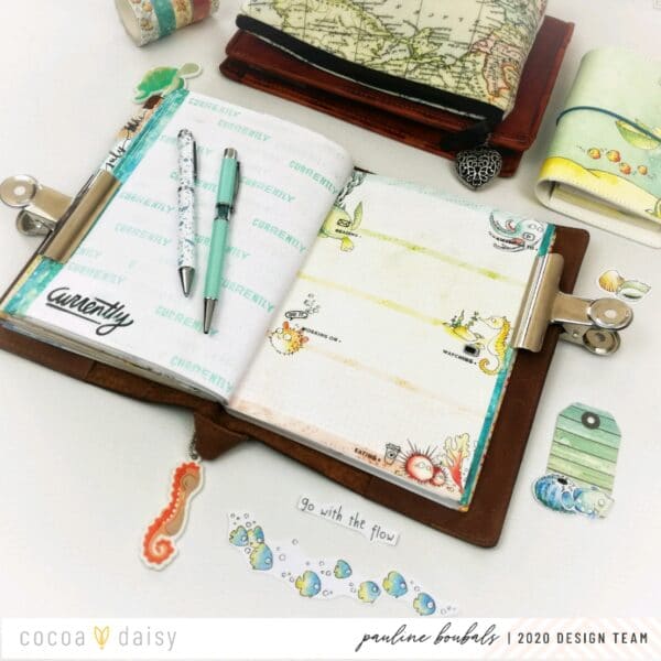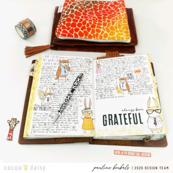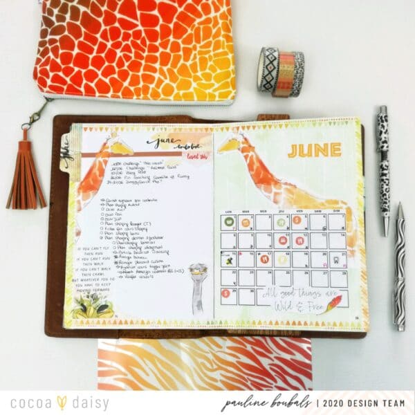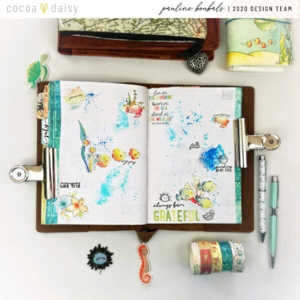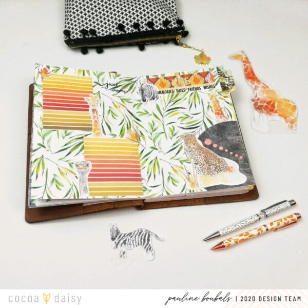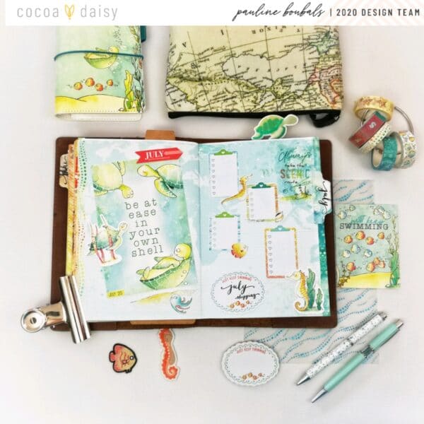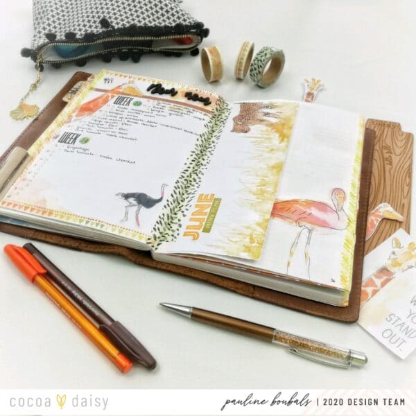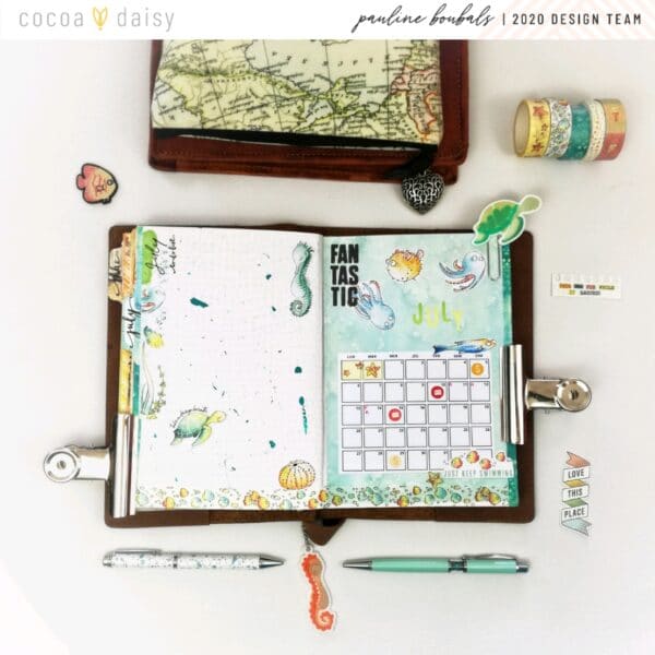 With the lockdown, my kits had troubles to come to me (I am still waiting for some by the way). So I had to change a bit my perspectives. In addition, I didn’t feel anymore to journal about my life in one page each day, or to memory keep so much. So when June didn’t came on time, I decided to try an A5 notebook, with only dots. That page was scaring me at the beginning, too blank. But finally I think it helps me to boots my creativity and I’m kinda love that ! That’s why I decided to do it again for July, in the same notebook. Do you know that Cocoa Daisy has an option “without insert” for the planner kit ? Or you can use the insert for an other thing than planning, but it will be for an other blog 🙂 .
