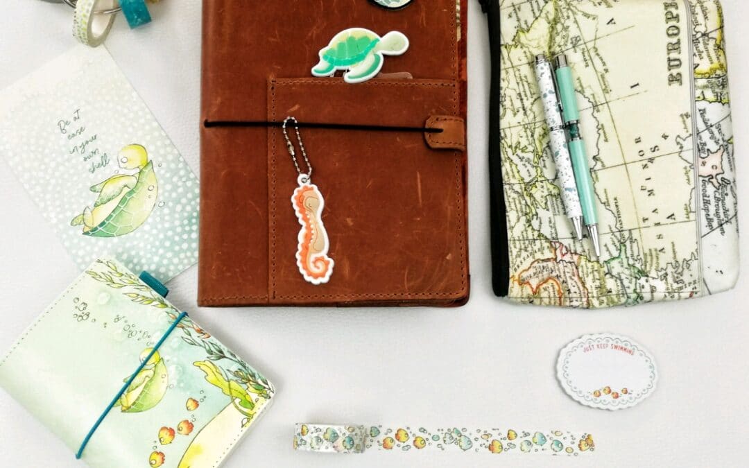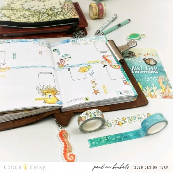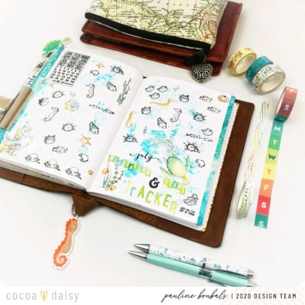 - My last monthly page is the steps and meditation tracker. For July, I used the same background technique and used a lot of stamping. I really love to use monthly stamps (this month there were stamps in main planner kit too !)) for my steps tracker and all those cuties fishes where perfect for that ! I also used stickers to add color to the page, and to cover my oupsi from stamping !