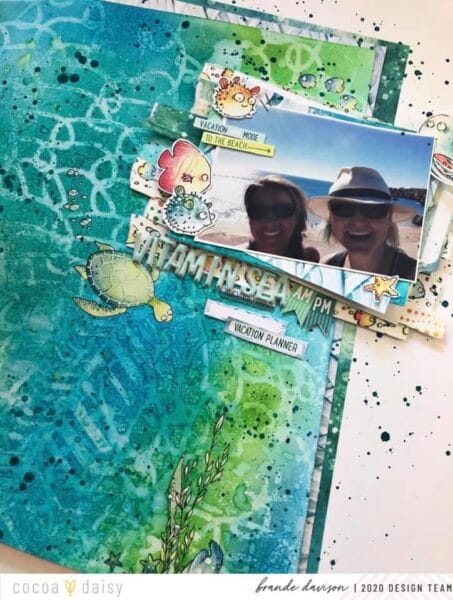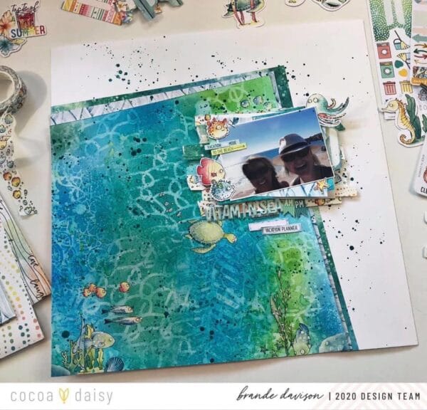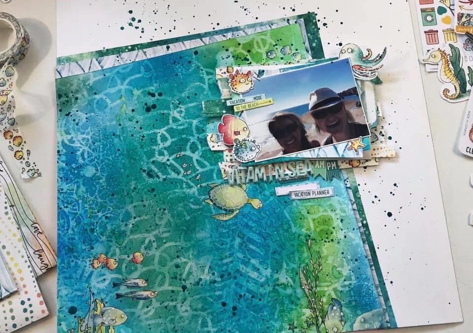 “I then cut that mixed media background on a jaunty angle, added a second layer behind with a pattern paper from the kit, and a third layer behind that with the bubbles washi. Then using all 3 washi in the To the Sea collection I made strips of pattern to layer the photo on, rubbed some of the rub ons onto the mixed media to create an under the sea scene and voila!”