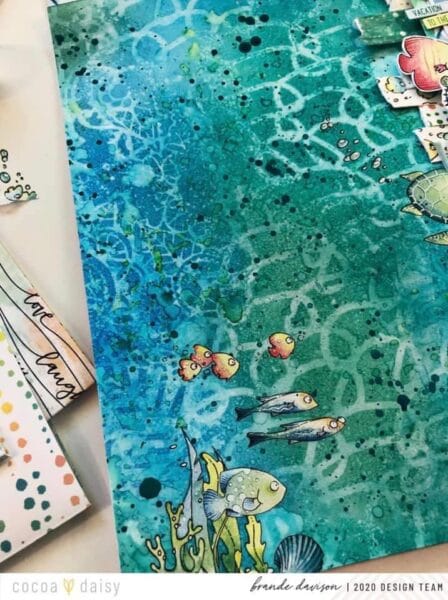 “With some Distress Inks in the same blues and greens as the washi, I used a blending tool to create a full background focusing different colours in different sections. Then I sprayed water on stencils and pressed those to the blended ink – the water reacts with Distress Ink drawing some away and you are left with a cool faint stencil marking. Finally I finished it all of with some splatters of water and some of the Ranger Ink, Dina Wakely Acrylic Paint (Peacock) in the kit.”