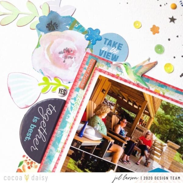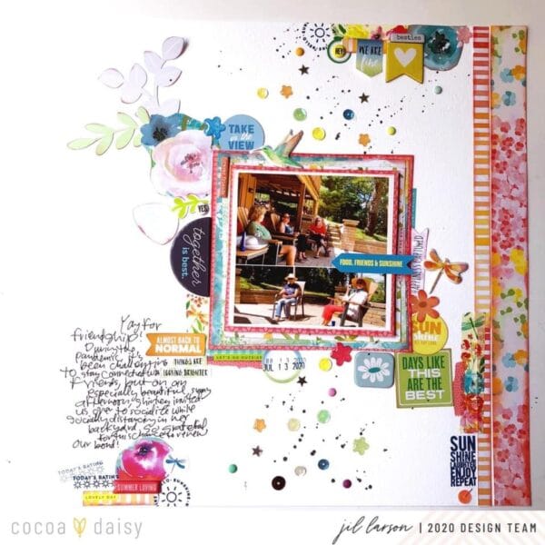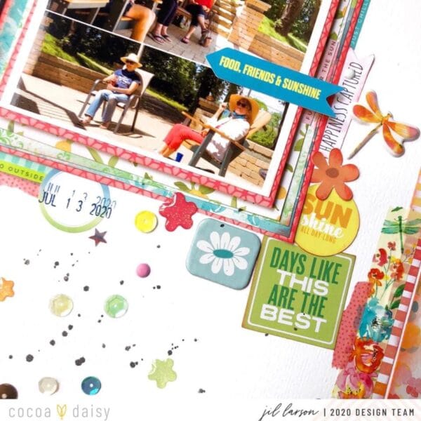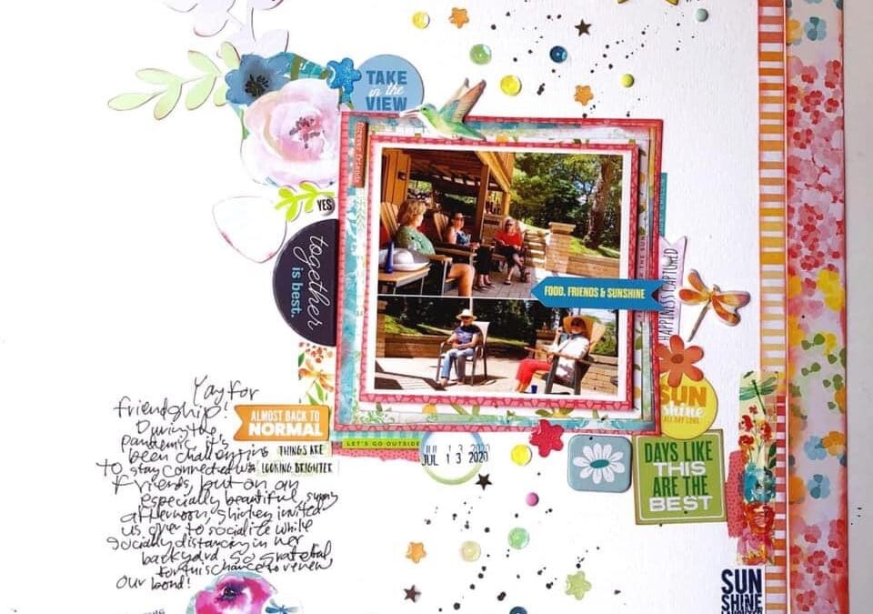 “I loved documenting this story of a recent sunny, backyard get-together with friends I hadn’t seen in months because we had been quarantined in our own homes. This colorful, exuberant page will help me remember how good it felt to be with friends again!” Jil’s clusters with stickers and the way she sprinkled the flower gems and puffy dots draws our eyes through her design. It’s such a fun layout and a great example of how to use stickers from a variety of our kits!