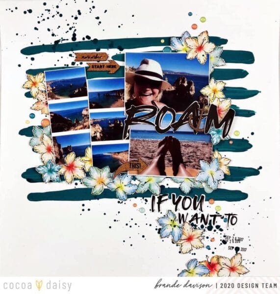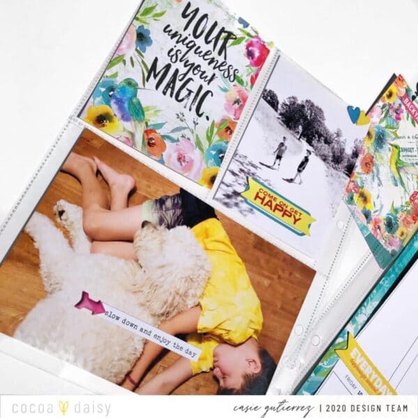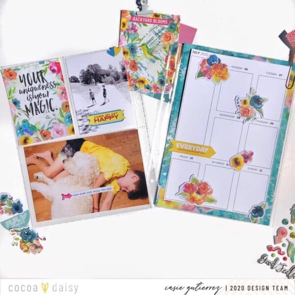“Hi Daisy fans! Casie here with a flower-filled layout using August’s Backyard Blooms kit. As you can hear me chat about in the video linked below, I am changing up my memory planning style for the remainder of 2020. I moved to a 6×8 album and am excited to return to pocket page scrapbooking.”