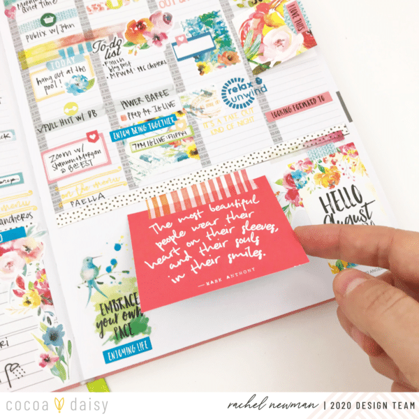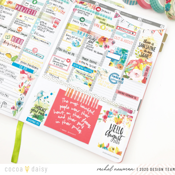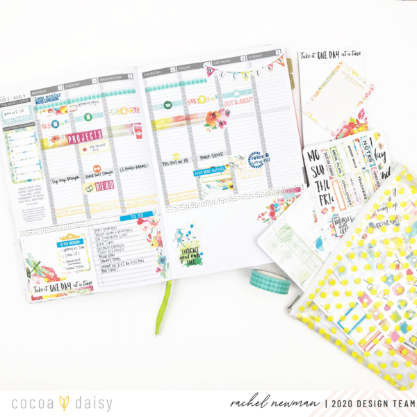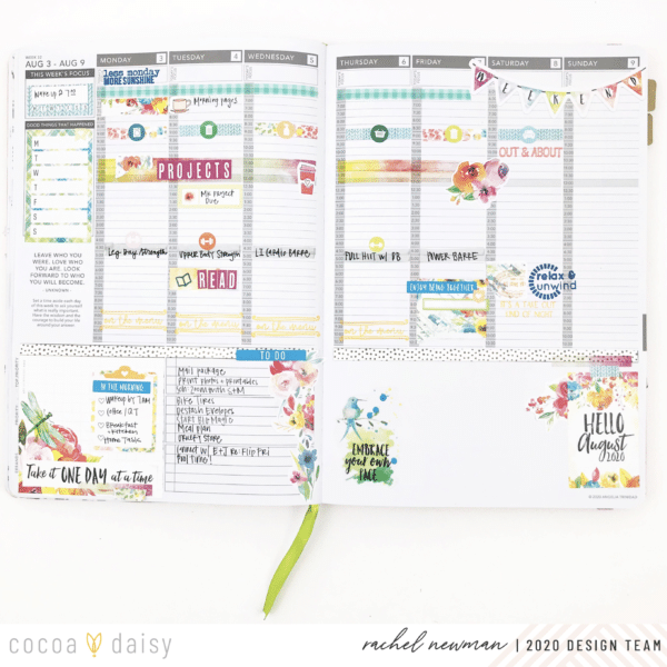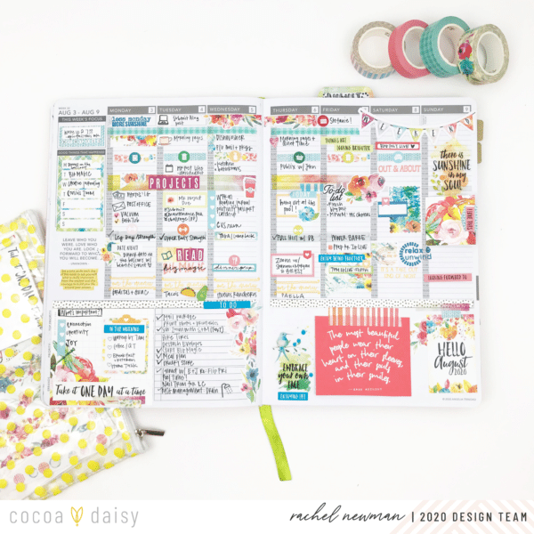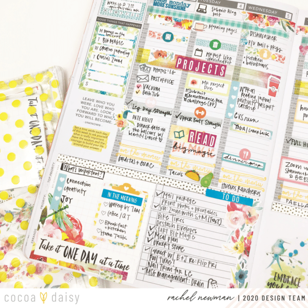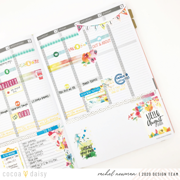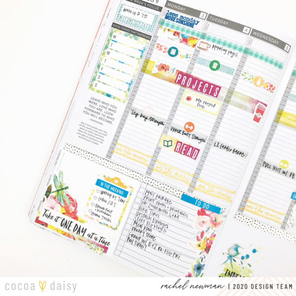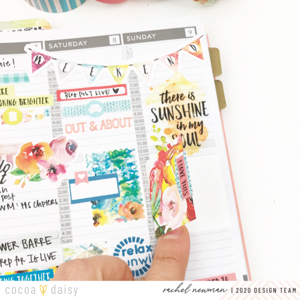 On Sunday, I sit down and create the foundation for my week ahead. This includes blocking time in my day for specific tasks or events. For me, if I don’t assign a time for important items, it is easy to forget (or avoid!) the intended tasks. Take exercise, for example. Recently, I have dedicated time each afternoon as my workout “appointment”. I highlight the time and write down the actual workout I plan to do. By having it in my schedule like I would an appointment, I am less likely to skip it. So, if it is important to me, or helping me reach a goal, that task gets a block of time on my schedule. I use the Cocoa Daisy washi, stickers and stamps to embellish the space and help draw attention to it.