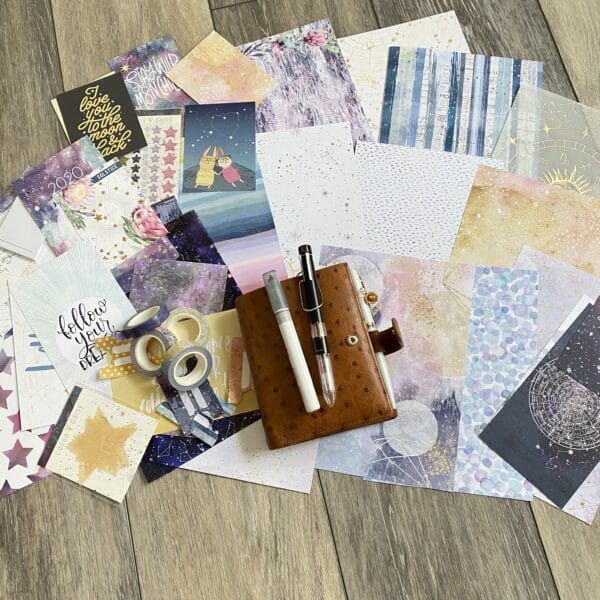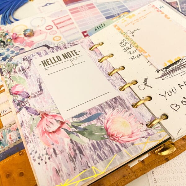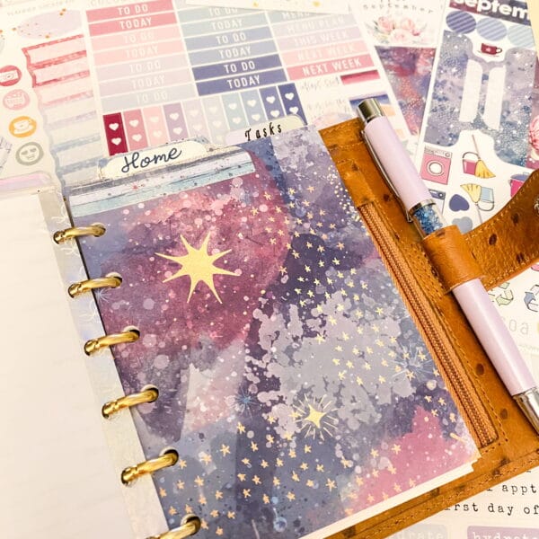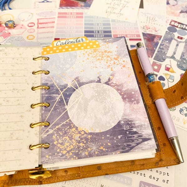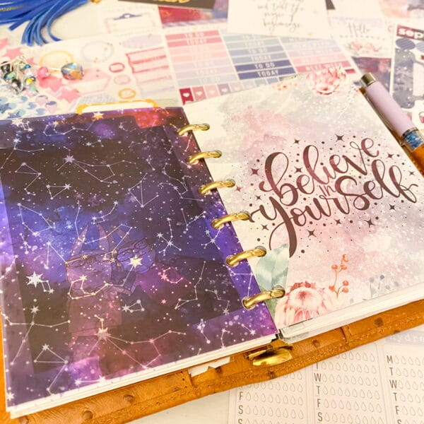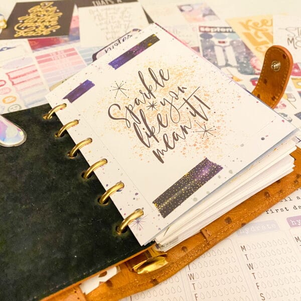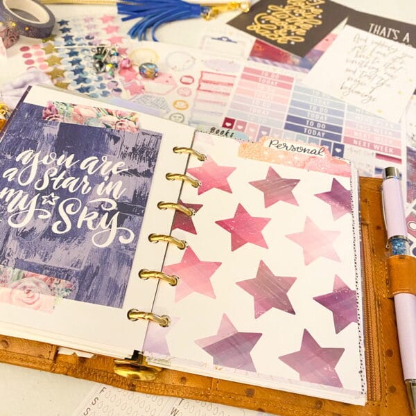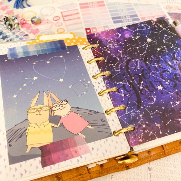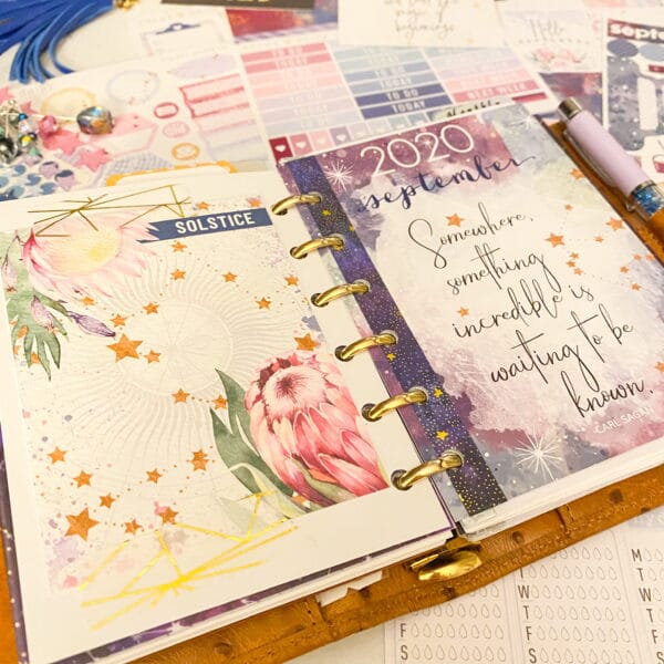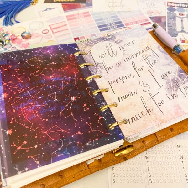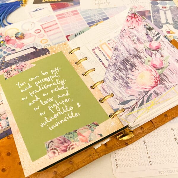 Right after the fly leaf, I just cut out a pretty paper for a dashboard. Y’all know that I tape pocket cards allll throughout my planner. I love the quotes and pops of color they add!