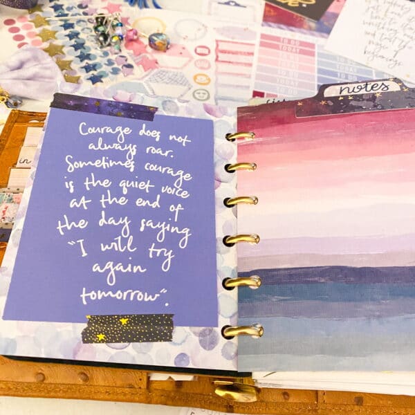 Right after this card is my first section – my notes section. On the left side there, you’ll see the quote card. You all might recognize it from the January kit. It had stayed in my planner all year! I love this quote so much – I have no plans to take it out.