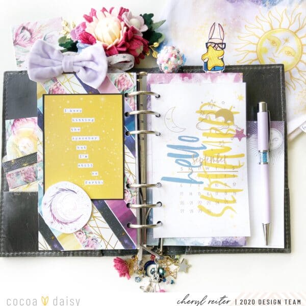 The colors are amazing! A mix of cool and warm colors with deep purples, indigos and blues as well as warm yellows and golds! It has a decided celestial theme along with a gorgeous sun! The right hand side dashboard, I cut down a 4″ x 6″ card from the Pocket Memory Keeping kit to add as a divider and added a clear overlay with a gold foil embossed calendar on top. The left hand dashboard is a mix of the gorgeous washi tapes laid side by side with a pocket keeping card on top!