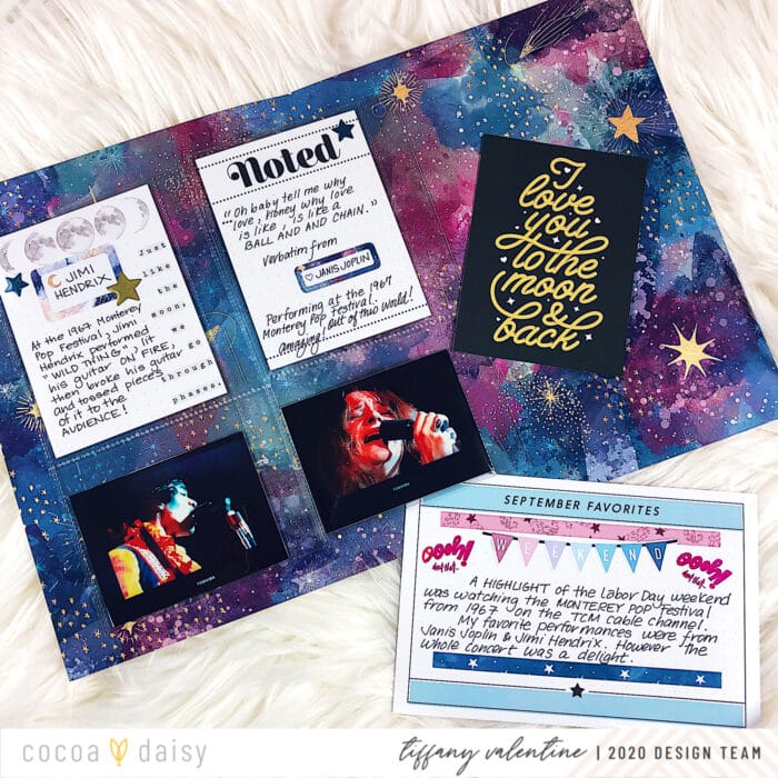 “I keep hitting the spacebar, but I’m still on Earth.” That pocket card (above) describes how I’ve been feeling while stuck at home during the COVID-19 pandemic. After watching Joplin’s performance, I think I need to belt out a few of her songs in the morning. That will get me psyched to tackle the day! LOL. The journal cards, gold vellum and enamel stars used above can be found in the Solstice Memory Keeping: Pocket Kit.