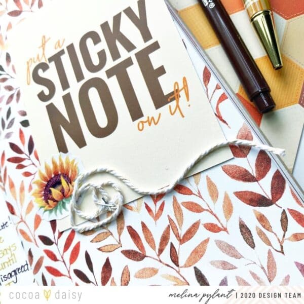 “I love how it adds to the card and sunflower sticker. Of course I also love the “rule of 3” when creating so I added one more swirl element with my pen and made a wind swirl for the leaf stickers/die cuts to dance on. A combination of alpha stickers and die cuts completed my title.”