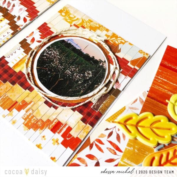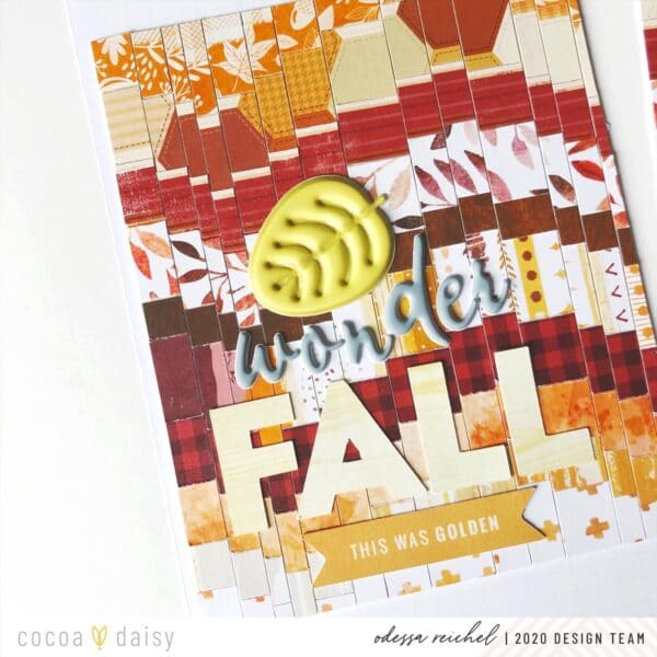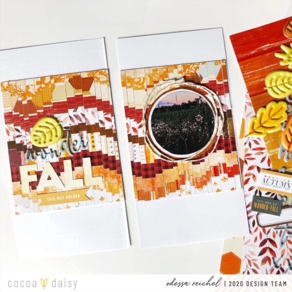 “I cut thin lengthwise strips of all of the papers from the Flannel & Frost collection and arranged and adhered them on a thin paper. I turned the paper around and cut strips from it agains the direction of the original cuts. I then glued them down to a plain page in my Daisy Dori with each strip a little offset, creating some dramatic movement for my background. It’s a fun way to play with the patterns and then you can use them all for your background instead of trying to pick!”