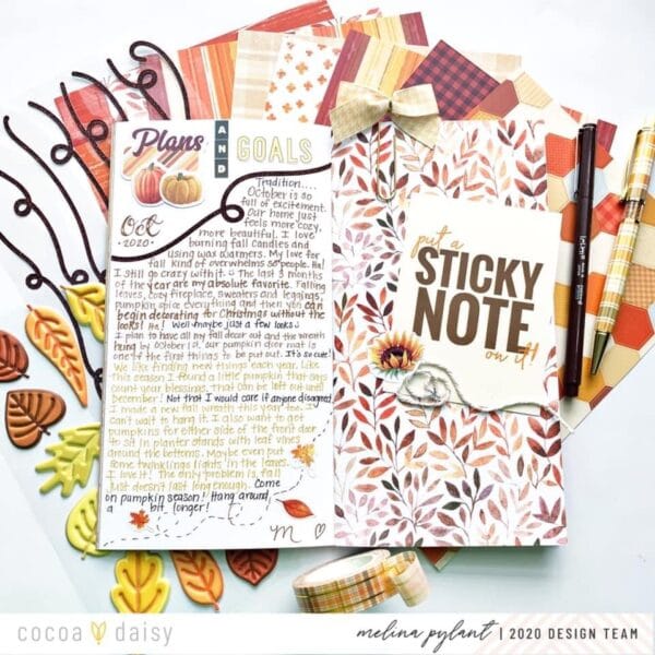 “I kept it simple with such a patterned background and featured a simple circular photo on top of a cardstock matte. On the other side of it I used the diecut letters from the Memory Keeping Classified kits to spell Fall and added a diecut flag underneath and some of the adorable puffy script letters above. To finish it off I used the sparkly twine that came with the planner kit as a nice border around my photos.”