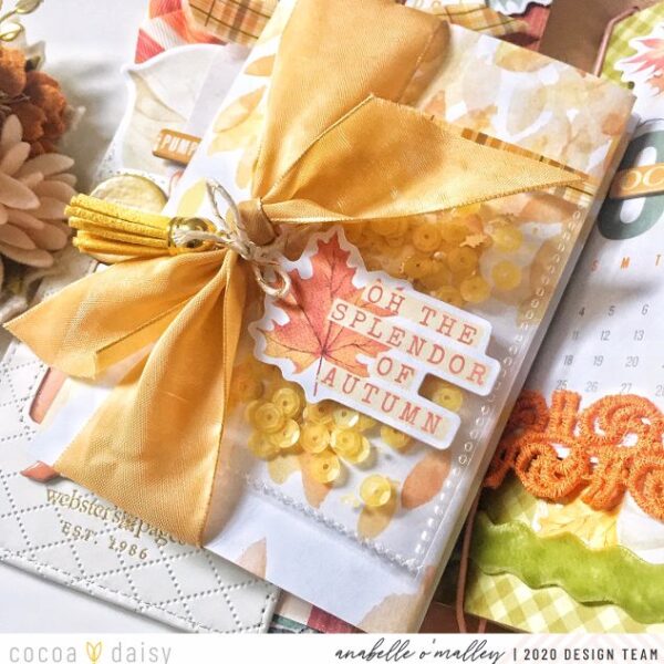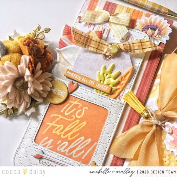 To start with, I love adding lots of layers and details to my pockets. On this one, I added a 3 by 4 card to the little window and surrounded it with chipboard pieces. Next, I decorated the tag that came with the kit. I used the puffy leaves (one of my absolute favorite kit pieces) and another piece of chipboard. I took a length of washi and folded it over itself to create a piece of ribbon to tie at the top. A glitter dot (my other favorite texture adding embellishment) tops it off. The tag is tucked into the pocket with some leaf shaped sticky notes. I added another pocket card and the ribbon clips to finish it off. I love the variety of textures and the layering on here.