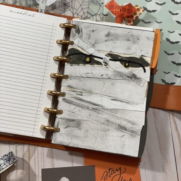 The mummy figure was a true labor of love. I kept putting paper down and it wasn’t feeling right. It wasn’t until I “accidentally“ got black stamping ink on the paper that I realized what was missing. So I embraced the mistake, and added more ink using my fingers to accent the mummy-wrap. And I love the way it turned out! Again, using some of the glitter dots and whimsical glitter edgers, I made the mummy eyes.