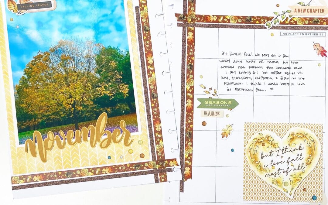 “On the right side, a square of pattern and a heart, both cut from 4×6 cards in the Pocket Memory Keeping Kit, give a little balance. More glitter dots, some falling leaves, and my journaling about fall finish this opening spread off for November.” Kristine’s start to November in her memory planner is just stunning!