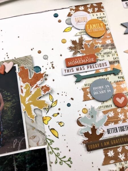 “With all the ‘busy’ on the right, I decided to use two photos with lots of embellishments on the left to give the page some balance. Including more of the fussy cut leaves, some rub ons and some splatters.”