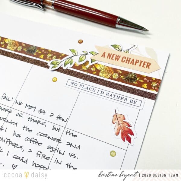 Kristine created this beautiful layout to document her start to November. “For this layout, I was inspired by this large tree outside my condo – the yellow and orange leaves looked so pretty against the sky, and I wanted to do a sort of ‘hello, fall’ type of theme. The beautiful brown washi from the Acorn Lane Planner Add-On kit caught my eye right away, and I felt it was perfect for this page.”