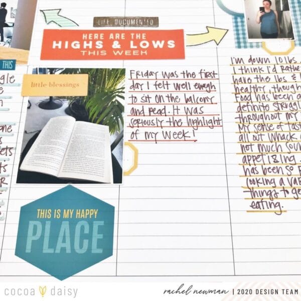 “I also like looking through the pocket cards, especially ones that I can alter for this format. I found two cards that (with a little tweaking) definitely helped tell the story of this week. I used one of the label stickers and alphas to change the “Home Sweet Home” pocket card to “Home Ugh Home” and trimmed it down to roughly 3×3 size. I trimmed off the “Highs and Lows” from a pocket card to act as my title for the right pages. The back of the card had little arrows, which I used to mark the high’s and low’s of the week.”