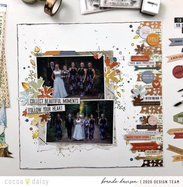 “I love how it turned out and am thinking I might build on this one to create a double page layout. Stay tuned, will share if I do!” Brande’s washi tape border on her traditional layout is a lovely placeholder for all the details she used to create her border. We love Brande’s placement of fussy cut paper leaves, rub-ons, die-cuts, enamel dots, and chipboard.