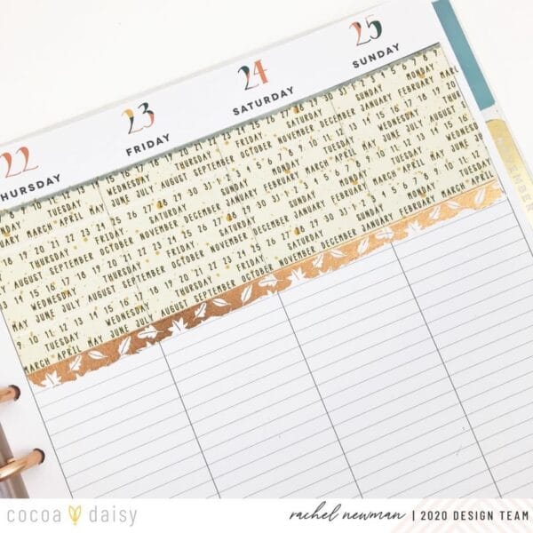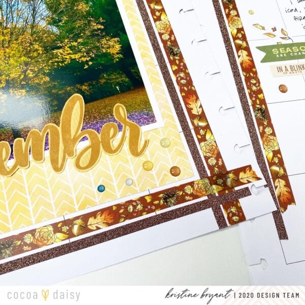“For this spread, I’m using the Acorn Lane memory keeping kits featuring a washi border. I decided to use two different washi’s for the border. To start, I placed several strips of the calendar washi down to cover the shaded boxes underneath. I ripped the leaves washi down the middle to give the washi an uneven edge and added it below the other washi. This helped to create a nice border between the washi “background” and the actual memory keeping elements.”