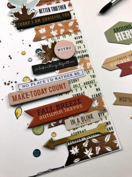 “I went through my stash and found a roll of brown glitter washi from a previous kit to accent the leaf roll, and made two simple but striking borders to anchor my pages. On the page with my photo, I added some die cuts, glitter dots, and the word ‘November’ cut from one of the 4×6 cards in the Pocket Memory Keeping Kit.”