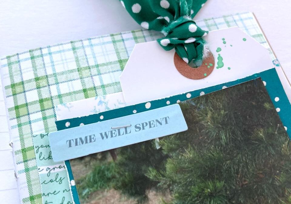 “This year I am using the Cranberry Rose Simple Dori Travelers Notebook to document stories from my childhood or specific to my life & Christmas. This particular spread is from our annual tree farm visit.