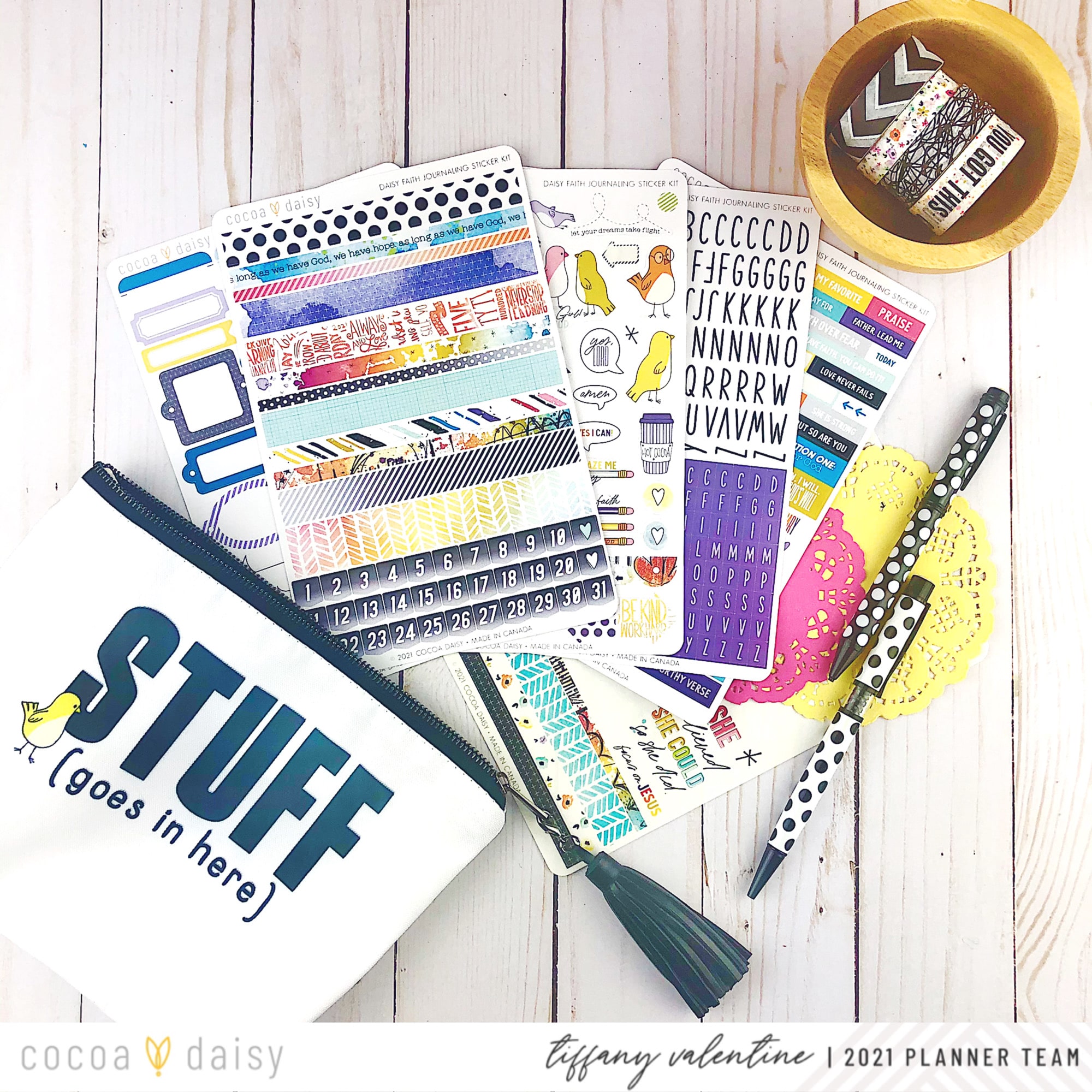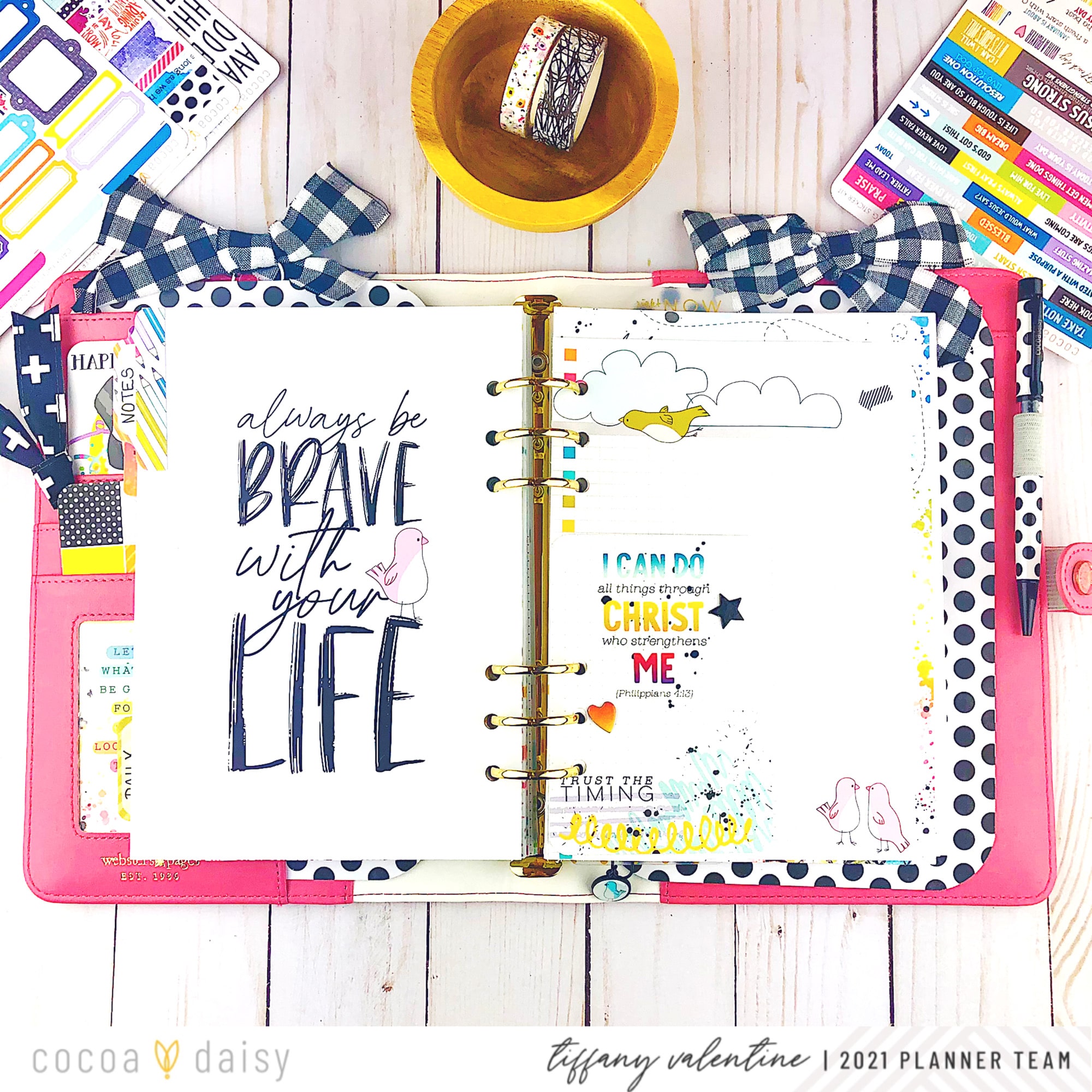 I was so excited to receive the new Bible Journaling Sticker Kit. It comes with a variety of stickers: alphas, phrases, labels, vellum sayings, and washi strips! Everything coordinates with Cocoa Daisy’s “New Chapter” January theme.