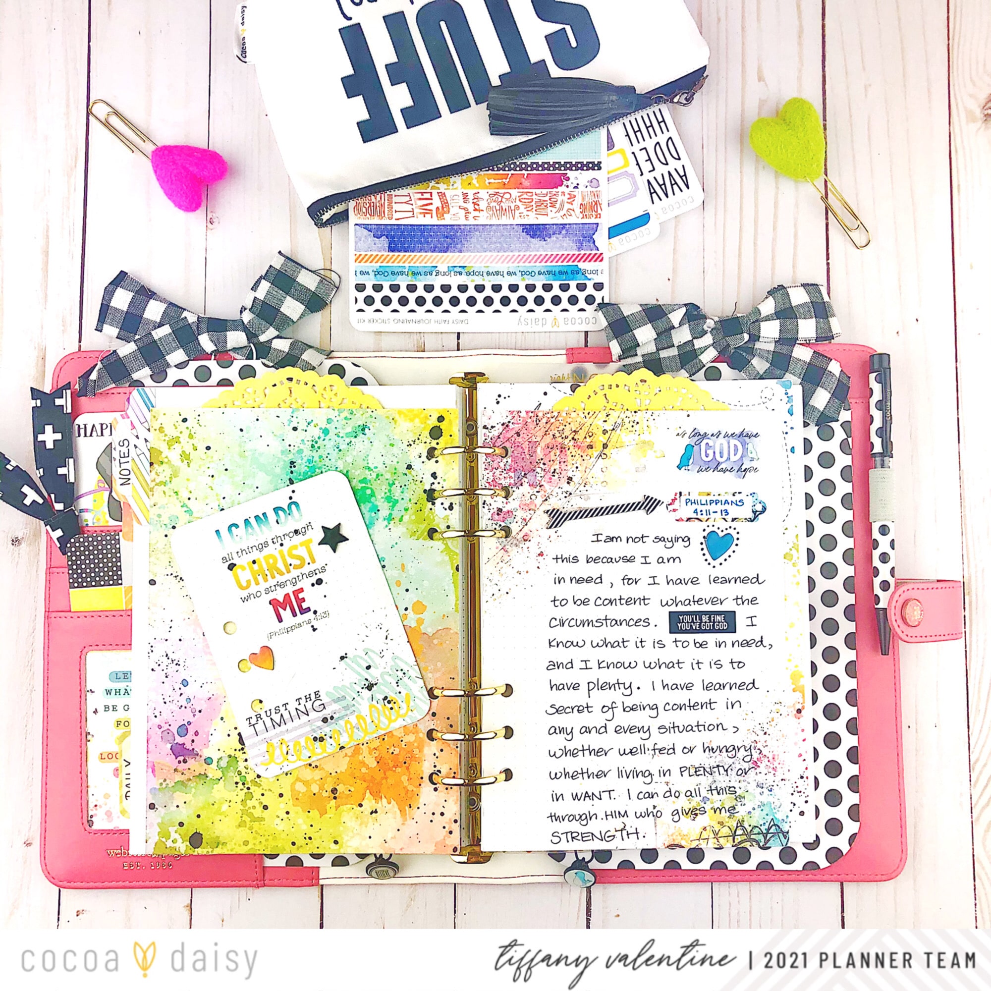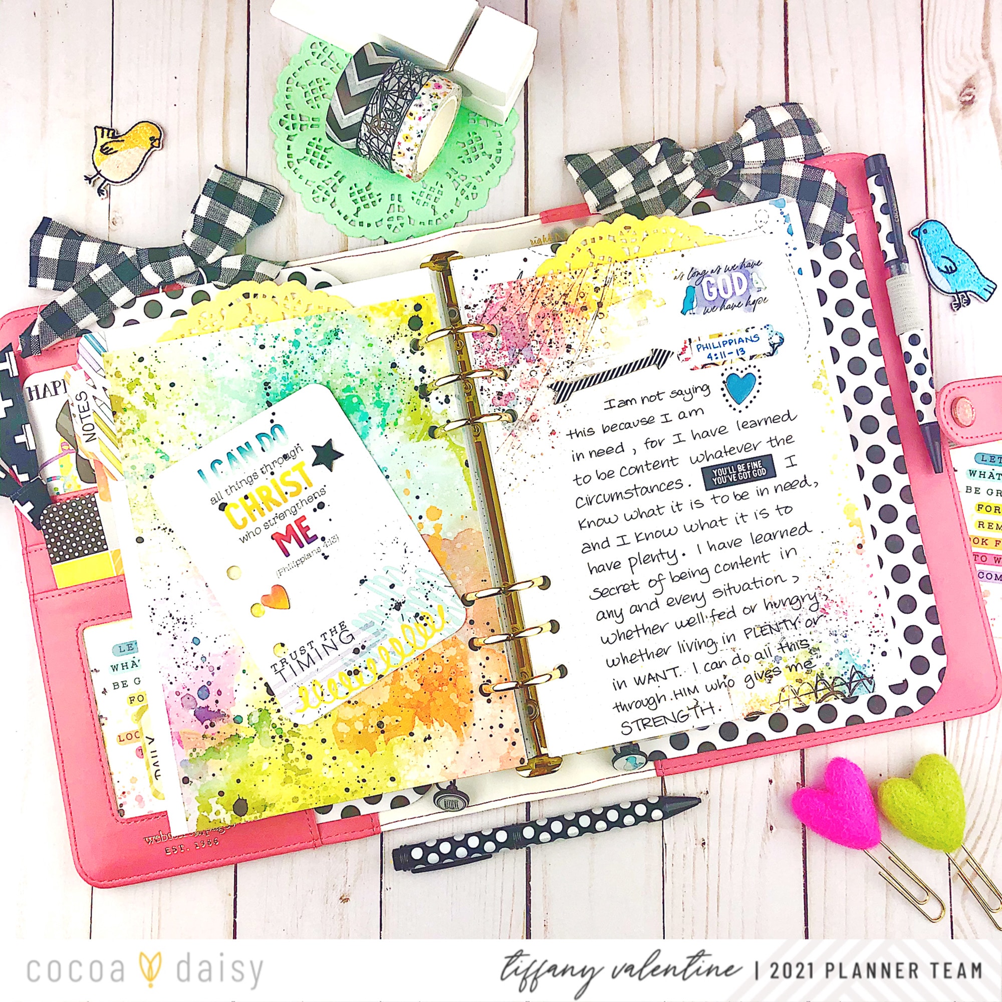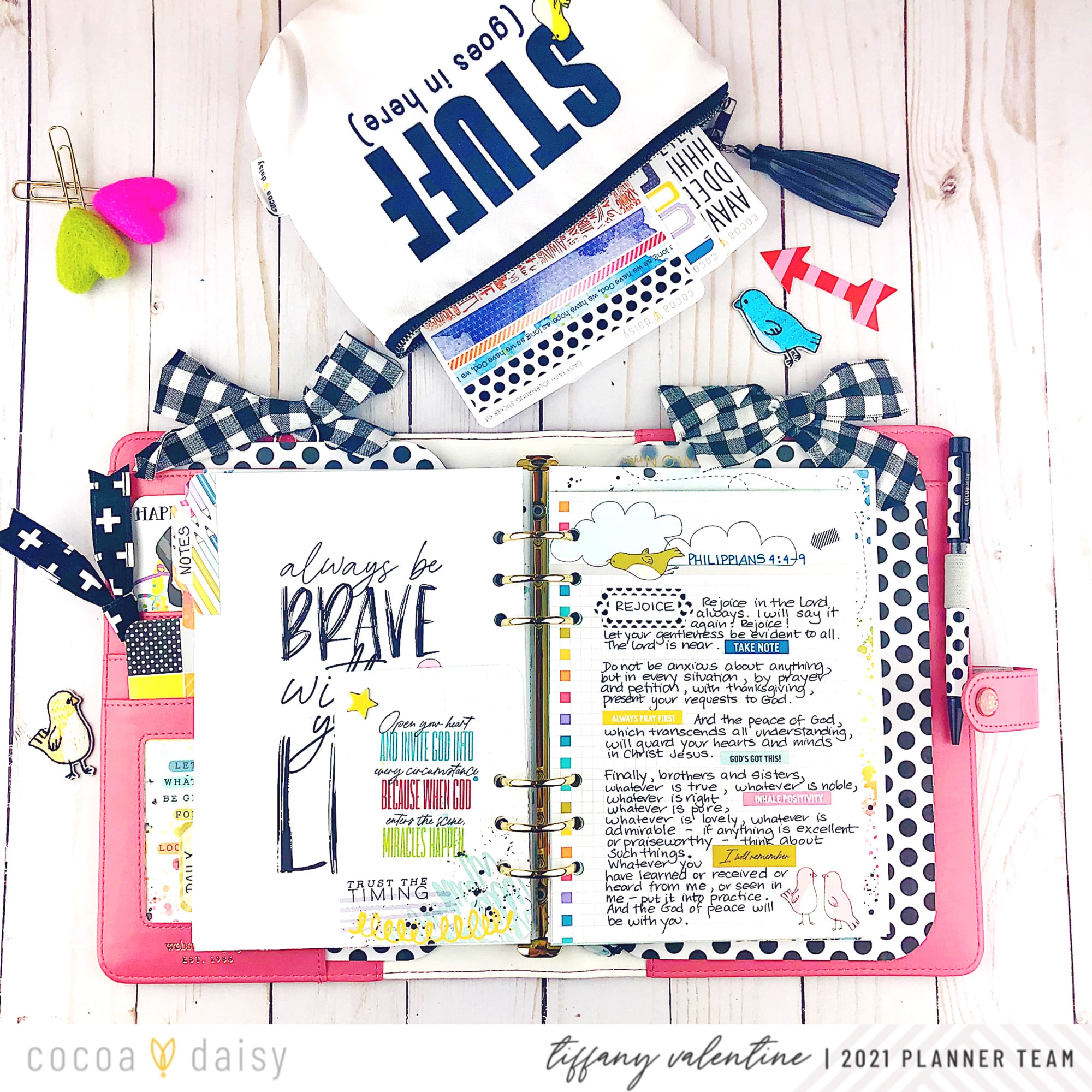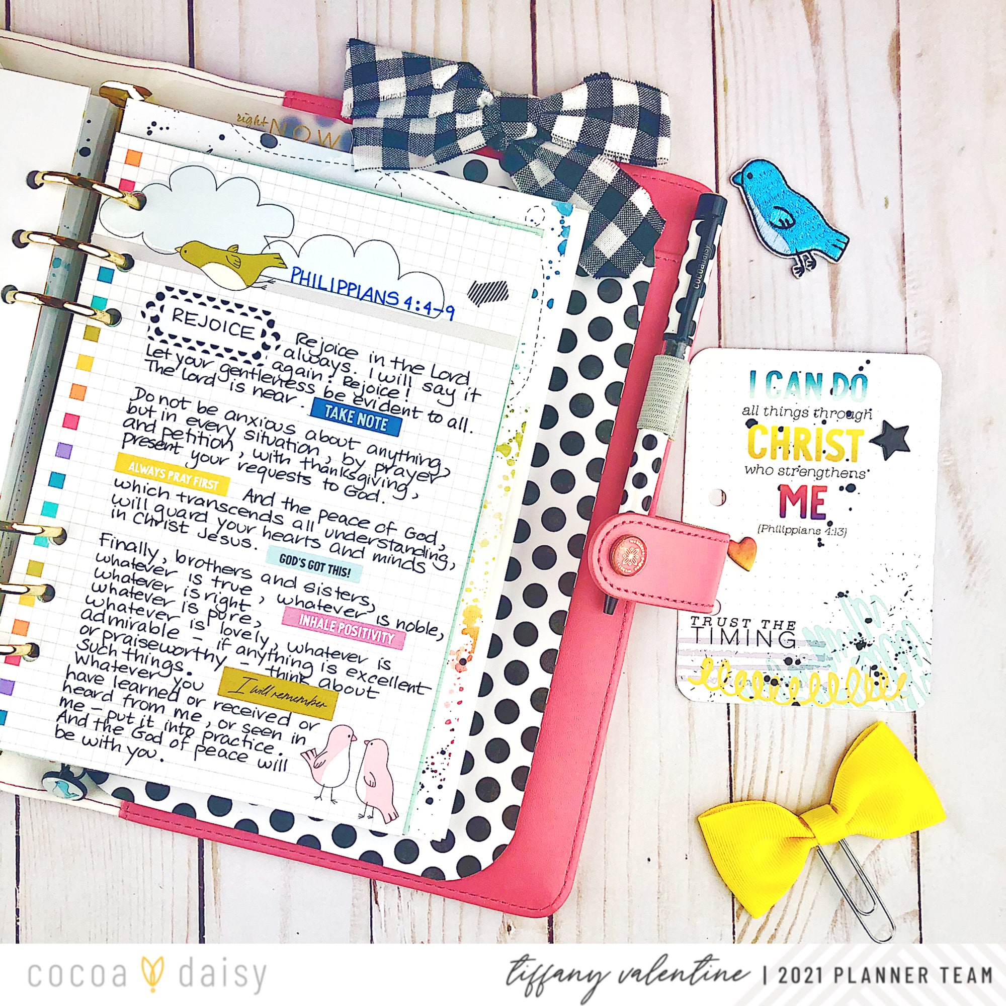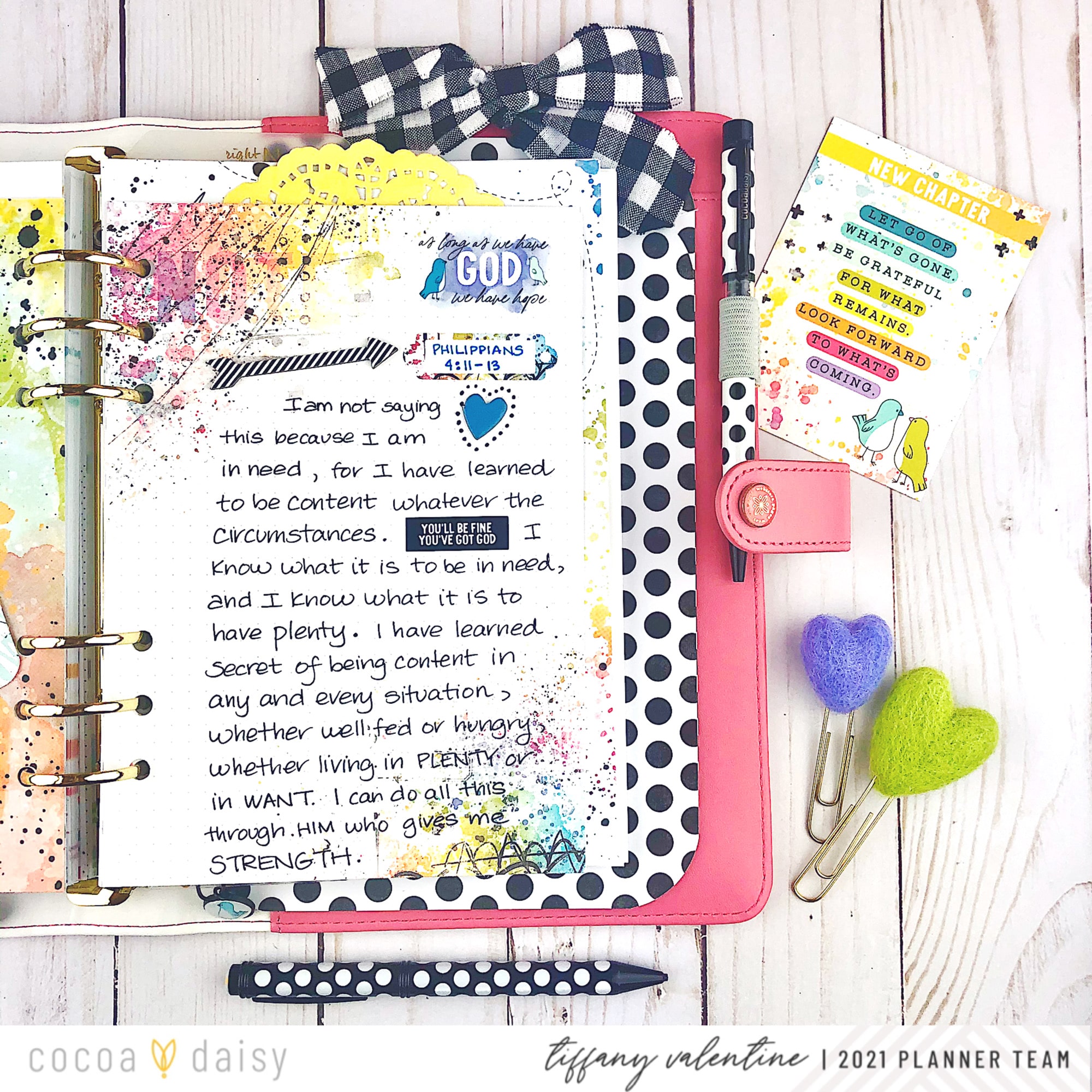 I also added the heart & star chipboard icons from the New Chapter Traveler’s Notebook Memory Keeping Kit. Next, I wrote out the words from Philippians 4:4-9, from the Bible. I added a label sticker to draw attention to the word, “rejoice”, and phrase stickers to add color and highlight parts of the scripture. Please note that the paper I wrote the passage on is also from the New Chapter freebies (found in the Cocoa Daisy store).