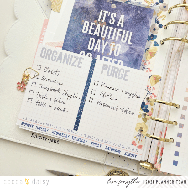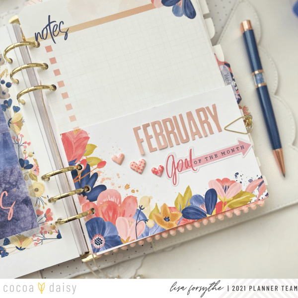For this next one I used this gorgeous 4×6 card and made it my February goal card. On the back I added two columns: organize and purge since these are the main goals I need to get done this month. I them punch them to fit my rings and I can check them off ad I go.
