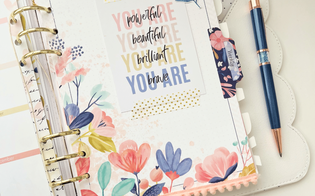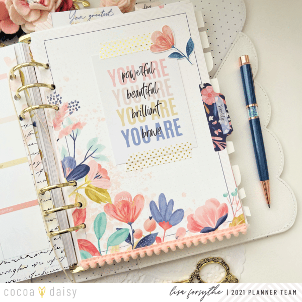 This last one is one of my favorites ideas I use almost every month! I love the monthly card and I especially love the new format so with the extra space on the top. I added a sticker from the new Daisy sticker add on kit (my new favorite sticker kit hehe). I added a strip of paper on both sides so I would have room to punch my holes. To make the tab shape at the top I used on of the planner tabs and simply hand cut around it. This makes a great page marker for my weekly section!