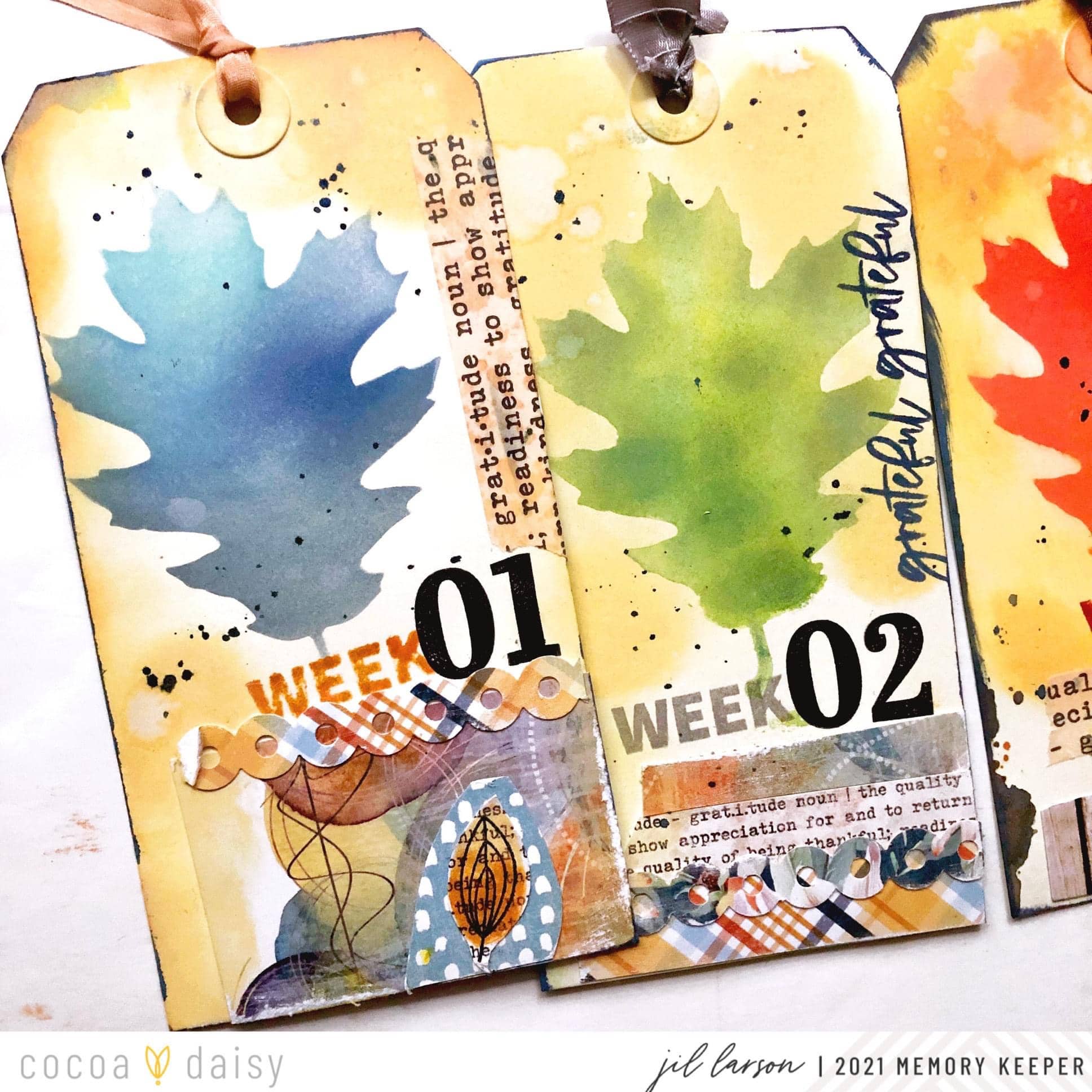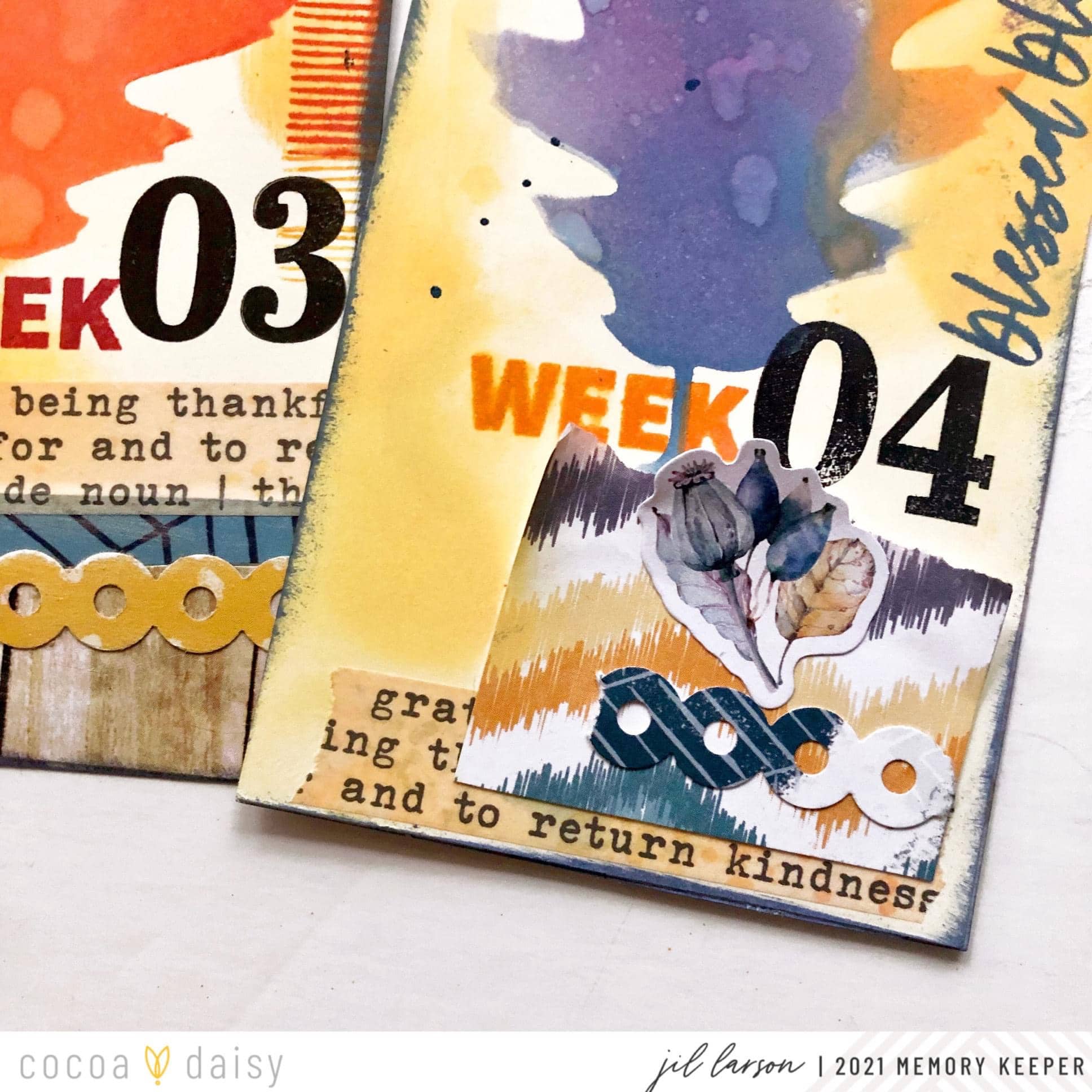 The tags from the Gather Classified: Memory Keeping Kit feature a large leaf made with the stencil in the same kit. On each tag, I stamped the number of the week with the wonderful number stamps in the Gather Modern Memory Keeping Kit.