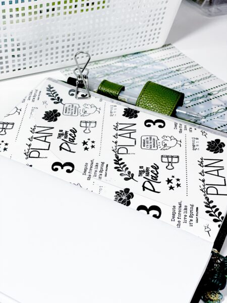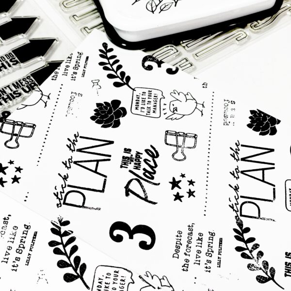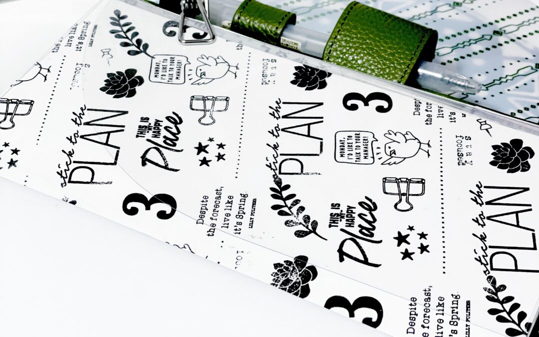 I came across this fun stamping idea on Instagram and decided to recreate the look with my favorite Cocoa Daisy stamps on a dashboard for my standard traveler’s notebook setup!