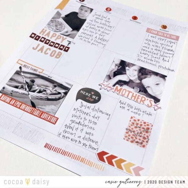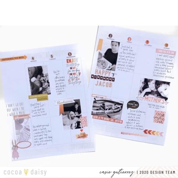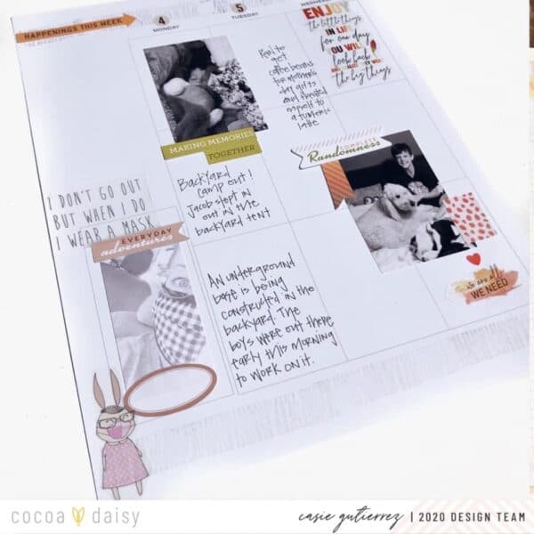 “I finished up the design using a Betty sticker from the free Simon COVID-19 printable.” We love memory planner designs and the endless options for using them to record everyday life. Casie’s design incorporates lots of labels to tell the stories for the week she is documenting. They help make each story within the week stand on its own.