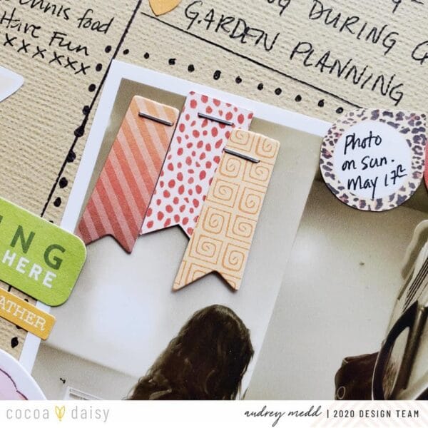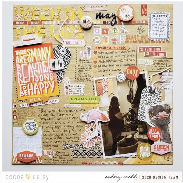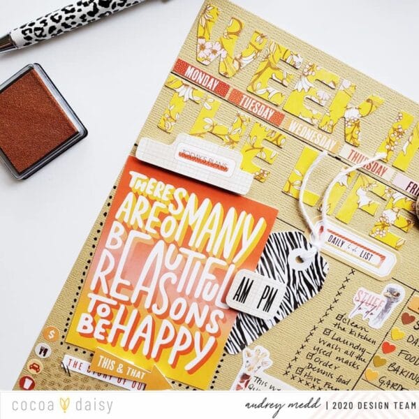 Now let’s take a look at Audrey’s amazing design. “Our challenge for this blog post was to use tags, tabs and labels. Cocoa Daisy has so many gorgeous options that you can find in all the kits that made it easy to accept this challenge! Because I just finished participating with the scrapbooking community in Week in the Life, I decided to make a 12×12 planner style layout to document some of the highlights.”