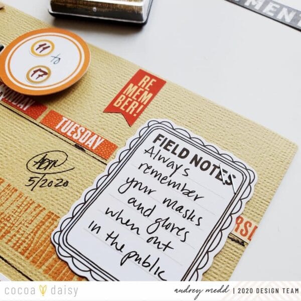 “I used tags, tabs and labels in so many different ways in this layout! Let’s explore some of them. My first for you is to use a tag, such as this ‘Field Notes’ die cut to document a small story or a reminder to yourself.”