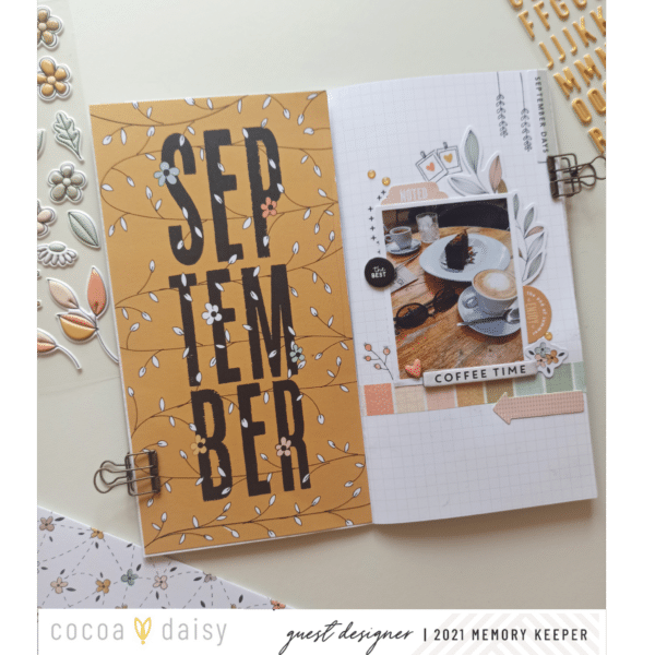 Our Traveler’s Notebook Memory Keeping Kit is perfect for documenting those little, every day, moments. Belen used the September dashboard from the kit on the left page and layered some washi, a picture and die cuts on the left. Memory keeping doesn’t have to be all about “big events”; take advantage of those small, everyday joy that are fun to look back on!