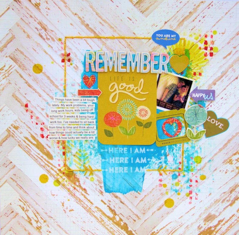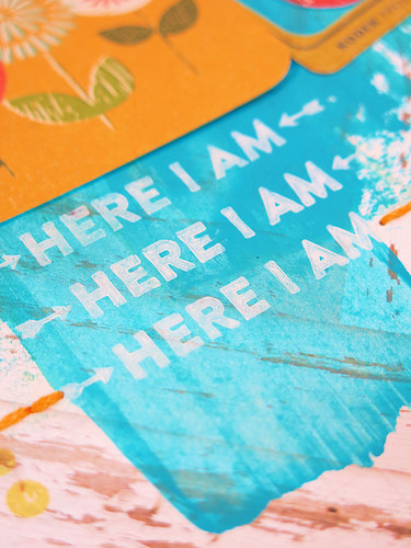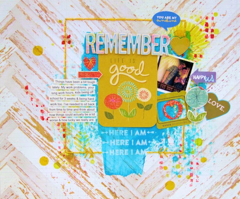 Seeing as this months kit is called ‘Here I Am’ I shall share with you my LO first using the ‘Here I Am’ stamp that comes as part of a set in the main kit this month.
