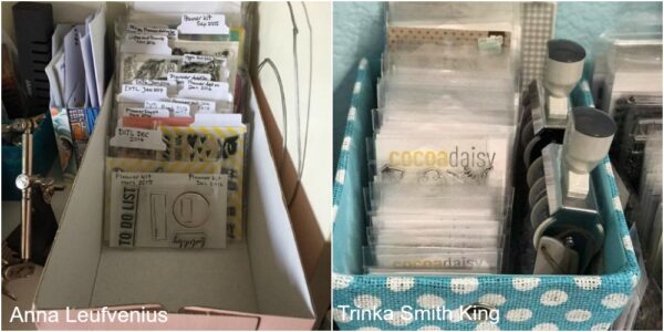 Meera is one of those members who doesn’t use some sort of box to store her stamp sets. She uses memory keeping sleeves to hold her stamp sets. She describes her approach: “I use tabs to name the categories: i have a card/ paper separator so each memory sleeve holds two categories: icons and alpha, Simon and owls, fall and flowers, travel and books, butterflies and birds, feathers and creativity, boxes and accents, and one called to sort!” Like Lindsay she also labels the sleeves with leftover tabs from the planner kits, then she puts the sleeves on washi rings and hangs them above her workspace. This allows her to have the stamps right in front of her and reach for them easily.