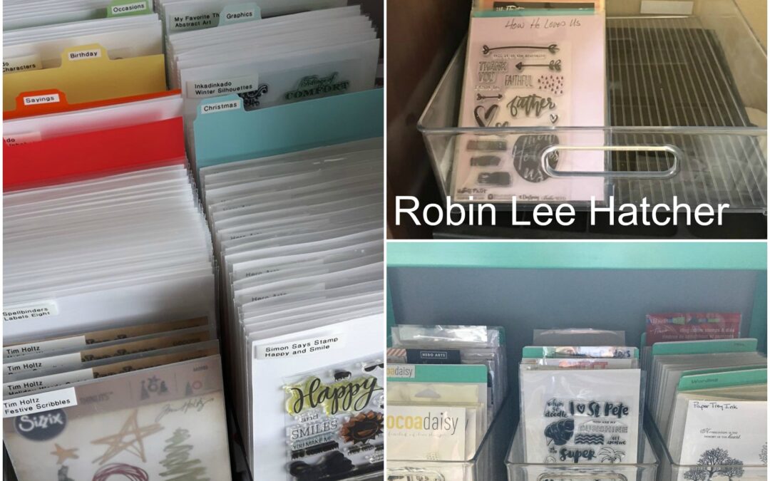 Shu-Wen, Robin and Jill all use various kinds of refrigerator storage bins. Shu-Wen and Robin also store their stamps in Avery Elle stamp envelopes. When asked about organization Shu-Wen says she divides her stamps into these categories: “Occasions, Birthday, Sayings, Letters, Christmas, Graphics, Floral, and Other. Whenever I’m crafting (scrapbooking in my Daisy Dori or making cards), I’ll usually flip through my newer stamps to see which ones I want to try using, then dig in through the relevant categories to hunt for matching stamps.”