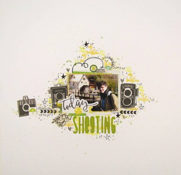 Moon goes for some subtle stamping that brings out the colours in her cheery layout that works so well on this layout it’s hard to believe it’s not just a pattern on the paper.