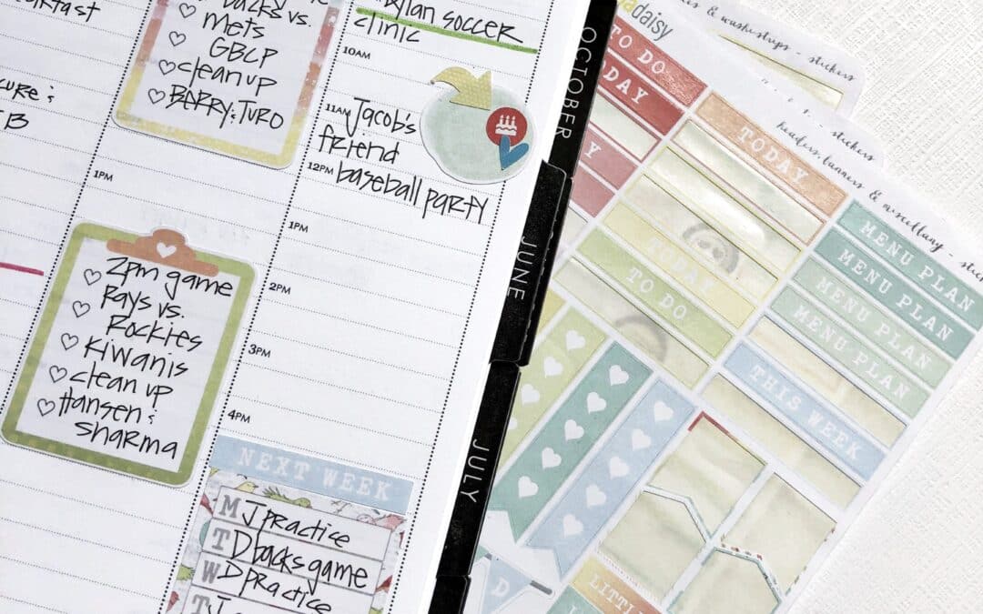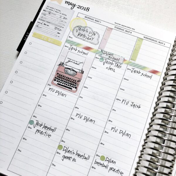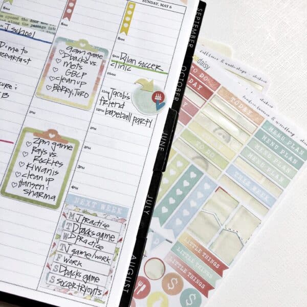 If you were to ask me to pick a favorite, I may list all of them but the clipboard stickers are my absolute favorite! In my role as baseball team mom, I need to send out reminders of field duty, dugout assignments and opponents. The clipboard stickers have room for me to list all that within one contained area along with a delightful pop of color. Another very functional sticker within the subscription is the vertical week at a glance sticker. I used this on at the bottom of my Sunday page to briefly list what was coming for the next week. This allows me to think ahead to upcoming events without flipping through all the planner pages.