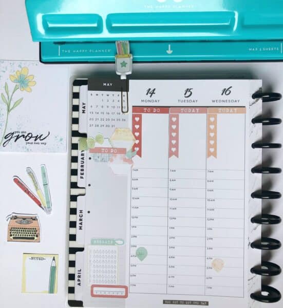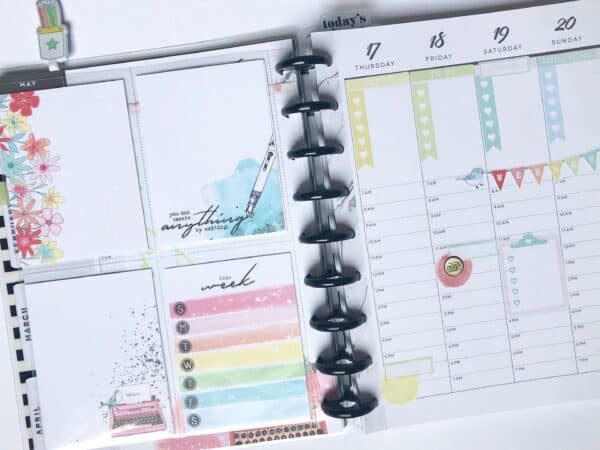 I still had more stickers to play with and decided to make a layout within my hourly Happy Planner. I used the colorful heart checklist sticker for the top of the page to highlight top priorities for that day. in the bottom corner, I added in the hydration tracker and week tracker to track journaling each day. I loved keeping them in rainbow order!