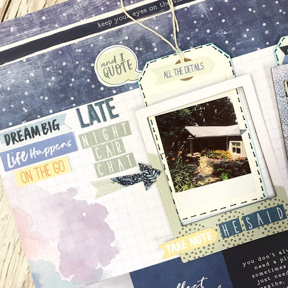 I used the chipboard frames from the kit and turned them in to pockets to hold the tags. One side was a photo and the other journaling telling the story.