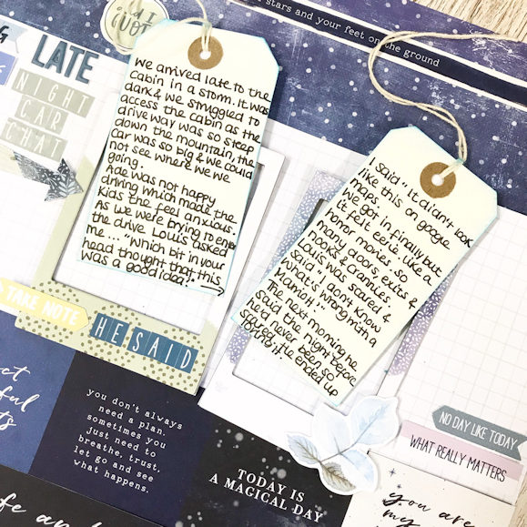 Use numbers, bullet points, journal cards, tags, lined paper, scrap paper, shopping lists, to do lists, die cuts, stamps, hand written, typed….. so many variations and they are all fun, quick and easy and all look really effective and will all tell your story or whatever it is that you want to document.