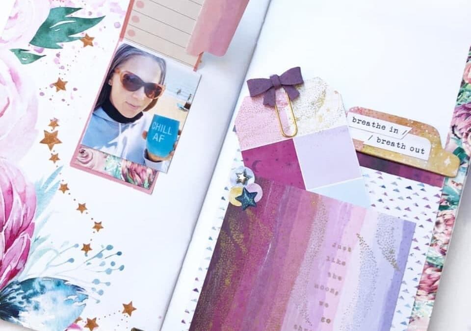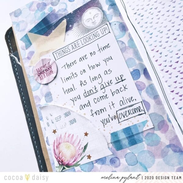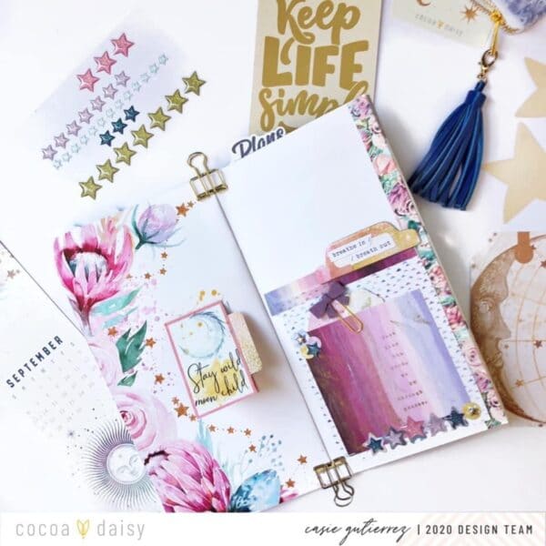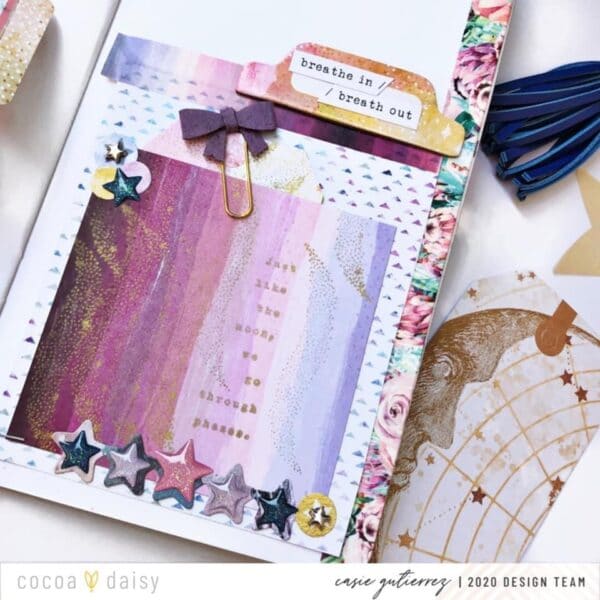 Next we have this soft and elegant design by Casie. “Hi there! I had a fun time creating a little stamp happy pocket for my traveler’s notebook. I loved the stamp that said ‘just like the moon, we go through phases.'”
