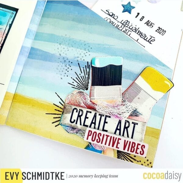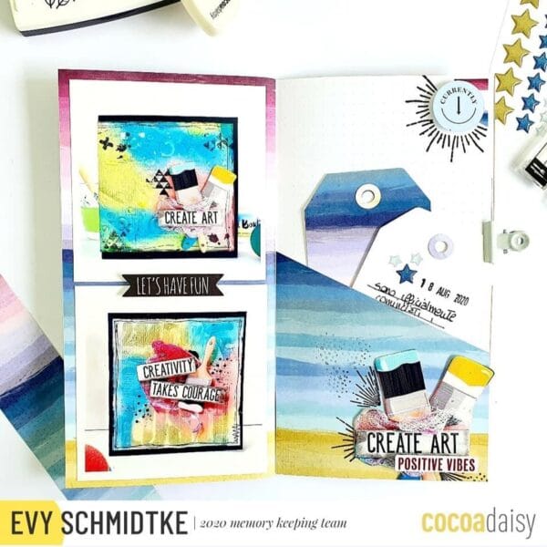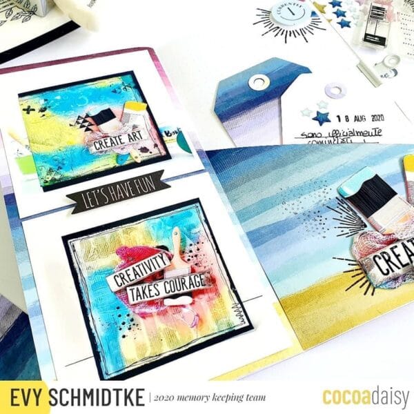 Let’s begin with a creative design by Evy. “Last month I already mentioned to you that I am following some video courses to learn the basics of mixed media and in this project I am showing you the first results.On the left page I wanted to make the photos of the first 2 cards made with this technique the protagonists by simply adding a central diecuts.”